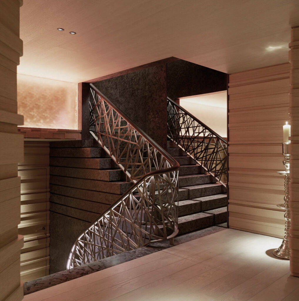 Rampe d’intérieur en laiton Chalet privé, Gstaad – Suisse / ©Remi Tessier Designer – Paris ©Photo Dan Glasser